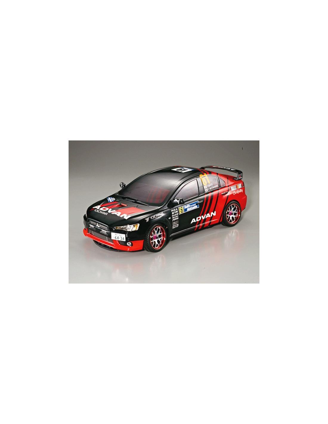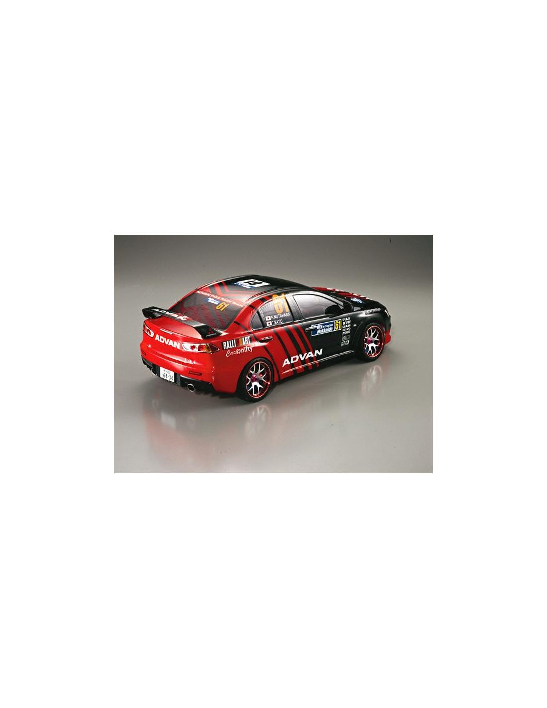 Carrocería sin pintar del Mitsubishi Lancer Evolution X para 1/10 (195mm). Incluye pegatinas y partes decorativas en plástico negro.