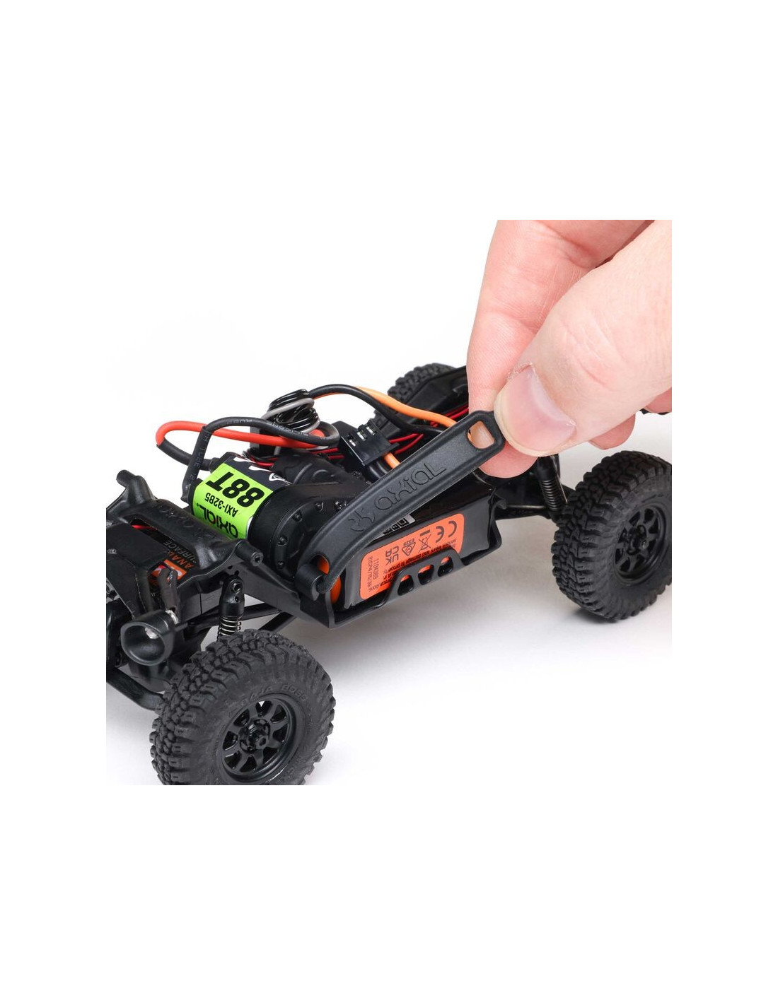 Por ejemplo, el Ford Bronco SCX30 está equipado con una placa de deslizamiento angular que le permite deslizarse sin esfuerzo sobre obstáculos difíciles, una característica que normalmente solo se encuentra en los crawlers de competición. Las carcasas de eje biseladas y las bieletas de dirección elevadas evitan que se enganchen. La estabilidad en ascensos se ve reforzada por la distribución del peso desplazada hacia adelante del chasis. Y eso no es todo: amortiguadores, rodamientos de bolas, un potente motor Axial 88T y la fiable electrónica Spektrum montada en la parte baja del chasis garantizan un centro de gravedad óptimo y el máximo rendimiento.