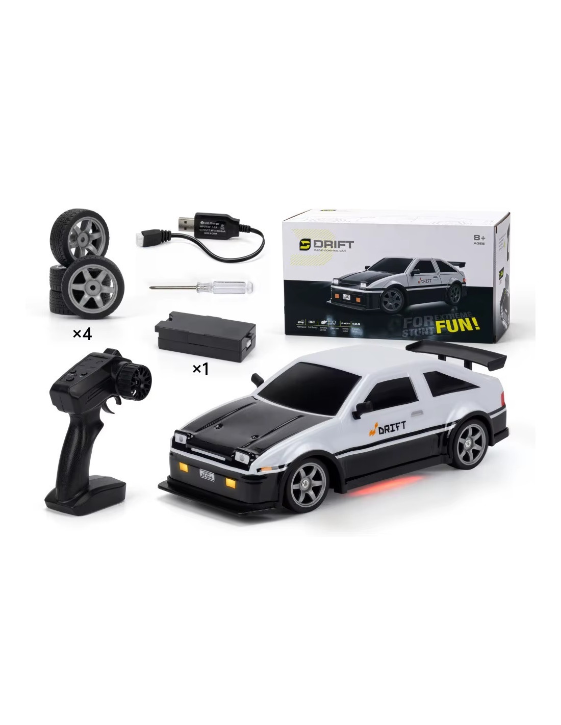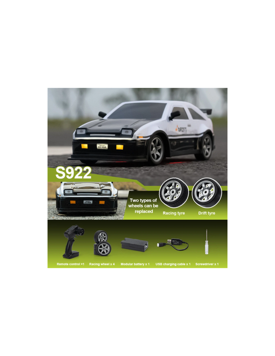 Coche de drift escala 1/16 muy completo. Incluye luces delanteras, traseras y bajo el chasis. También se incluyen 4 ruedas extras para escoger si quieres conducción Racing o conducción Drift: solo tienes que sacar con la ayuda del destornillador incluido, el tornillo de la rueda para cambiarlas, y listo!!