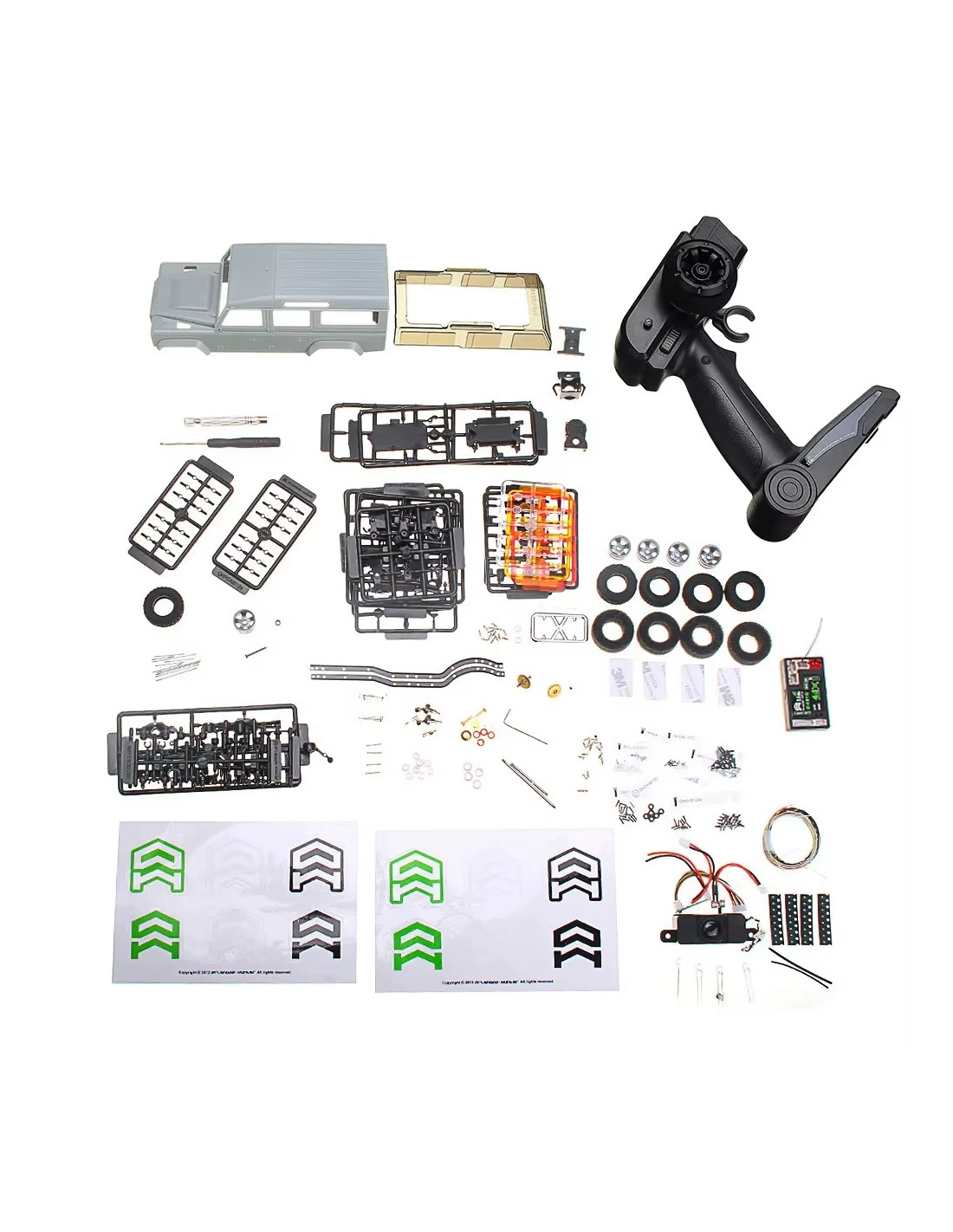 Kit RC para montar micro escala 1/32 de la marca Olrandoo Hunter. Modelo: Land Rover Defender D110. Este micro crawler viene totalmente desmontado, pero con todo lo necesario para montar y que funcione: Chasis, motorización, servo, Emisora 2.4Ghz digital, batería y cargador.