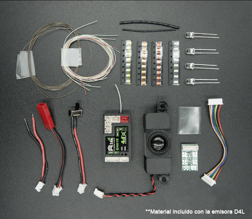 **Luces led, altavoz, receptor y cableado necesario para su montaje.