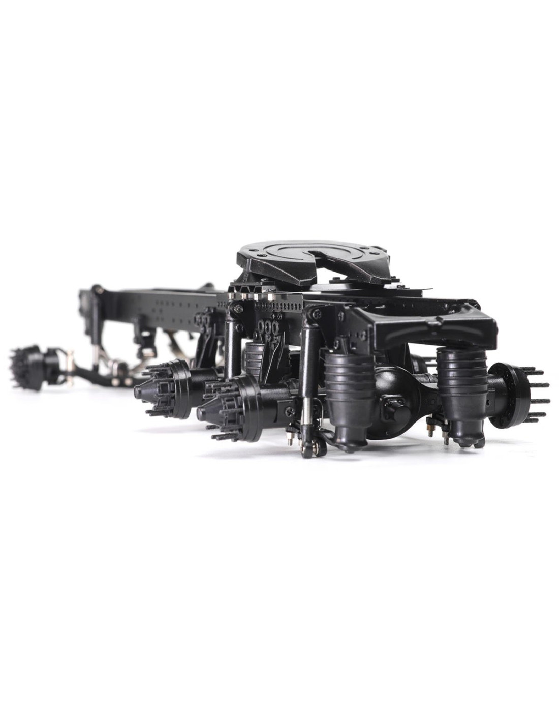 Ejes traseros dobles motrices con brazo de arrastre realista y sistema de suspensión neumática simulado.