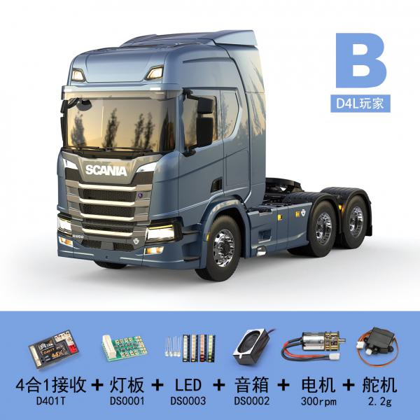 Kit RC para montar micro escala 1/32 de la marca Olrandoo Hunter. Modelo: Camión Scania 650 6x4. Este micro camión viene totalmente desmontado. Esta versión incluye: Chasis, receptor D401T SFX, motor con reductora, micro servo dirección, kit luces y kit de sonido.