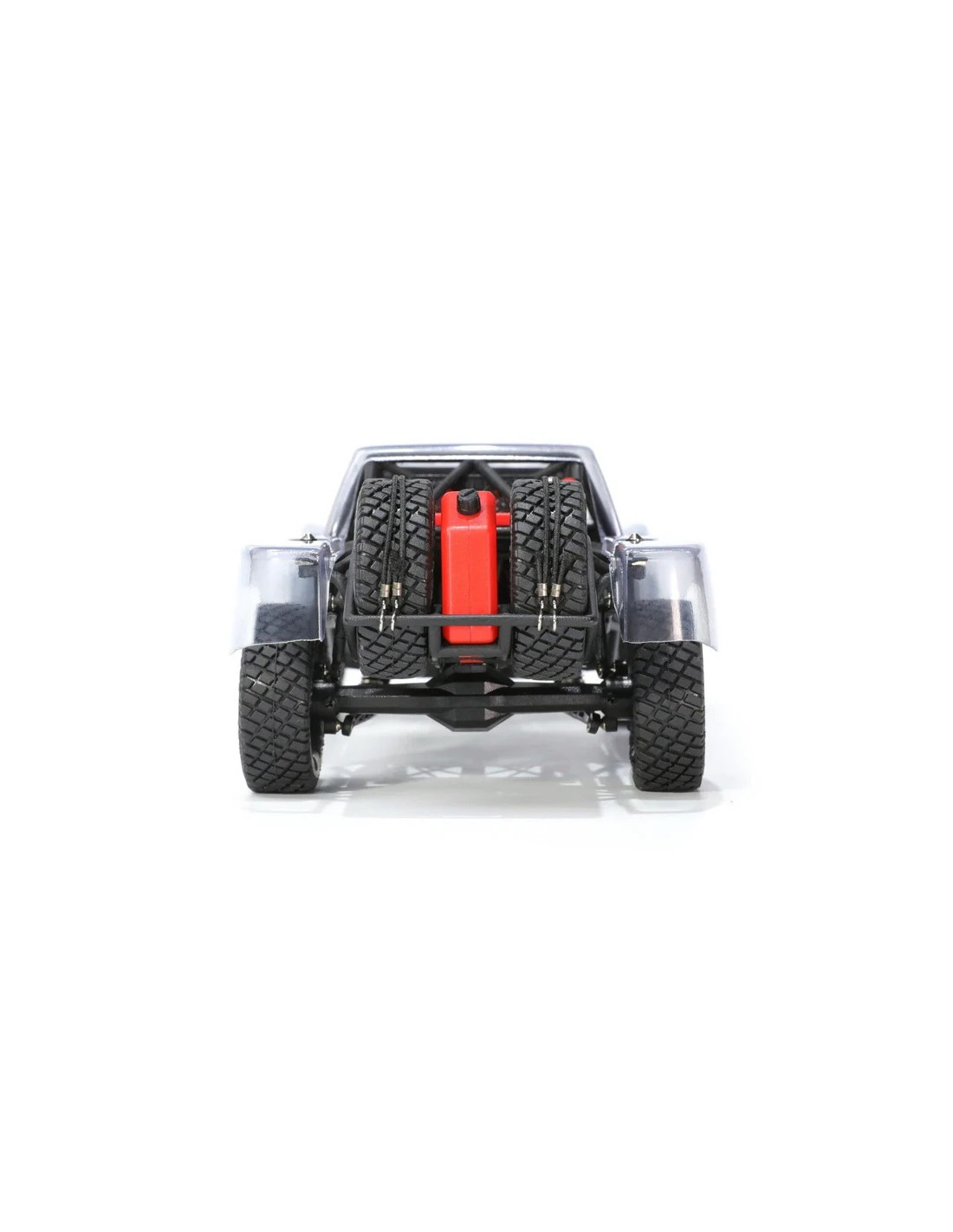 Se incluyen dos ruedas de repuesto, un extintor, un bidón de combustible, un radiador de doble ventilador de metal grabado, un panel de instrumentos superdetallado y otros increíbles accesorios a escala.