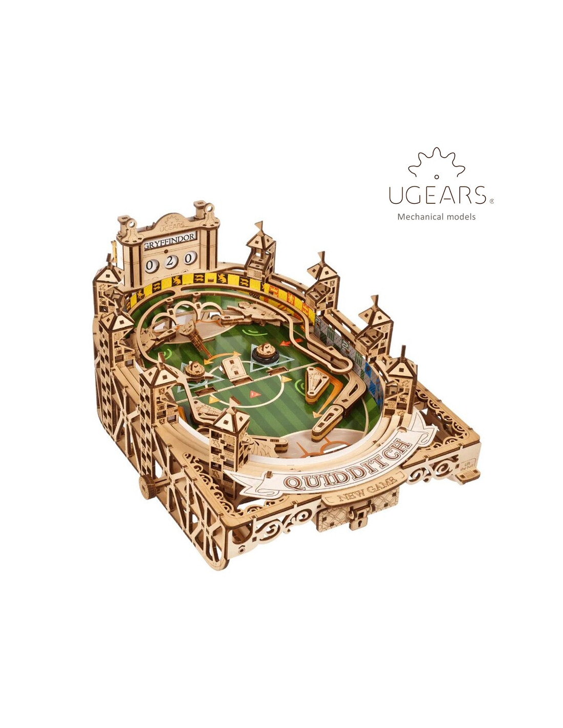La maqueta DIY Quidditch™ Flíper de Ugears es un estadio visualmente deslumbrante, con un campo hecho de cartón con elementos decorativos impresos, 8 tribunas elevadas en las que están grabados los logotipos de las casas del Colegio Hogwarts™ (Gryffindor™, Hufflepuff™, Ravenclaw™ y Sytherin™), un marcador operativo, una cajita para guardar la Snitch Dorada y las tres Quaffles™, así como elementos operativos del juego flíper, como paletas o flípers, rebotadores, dianas y obstáculos.
