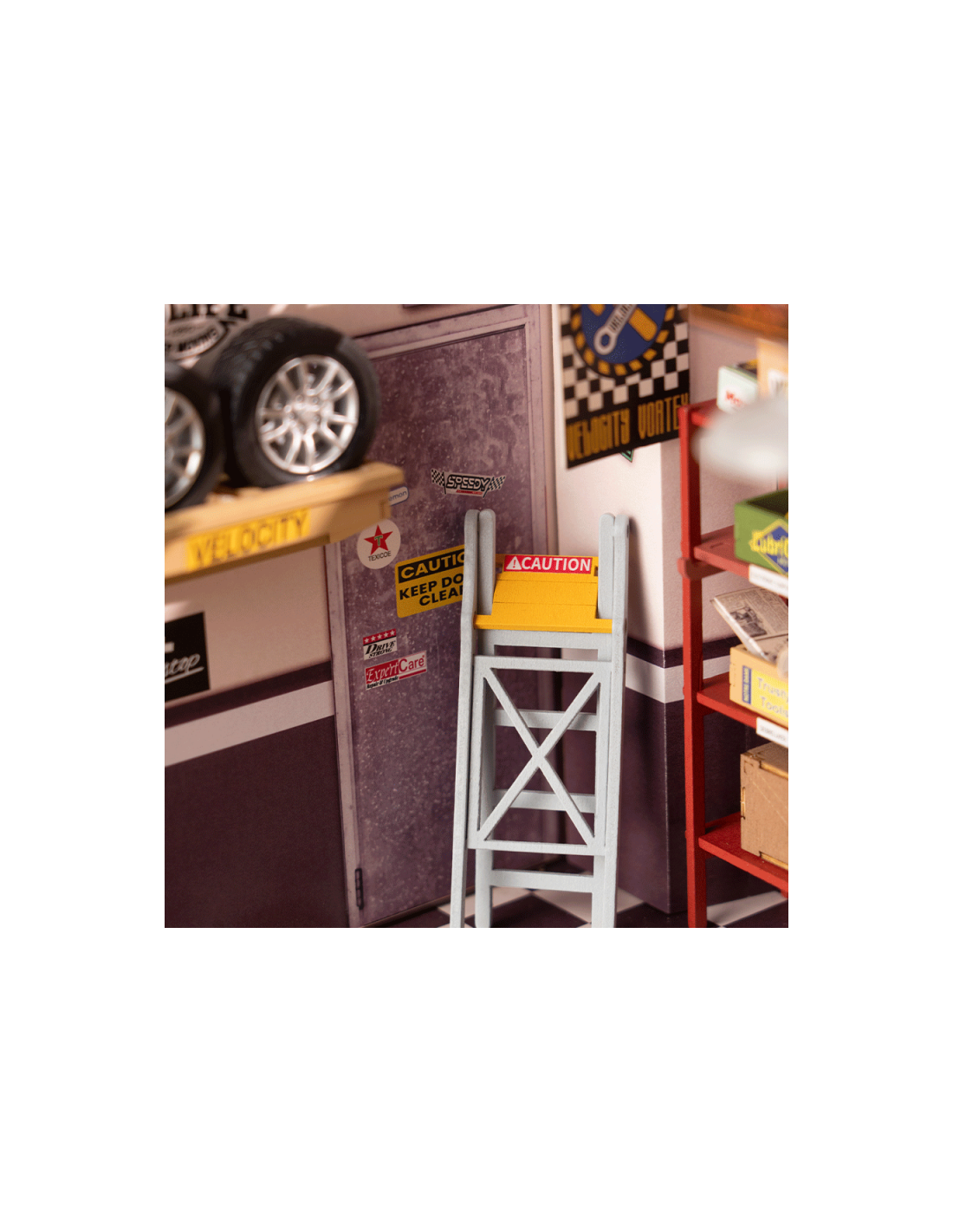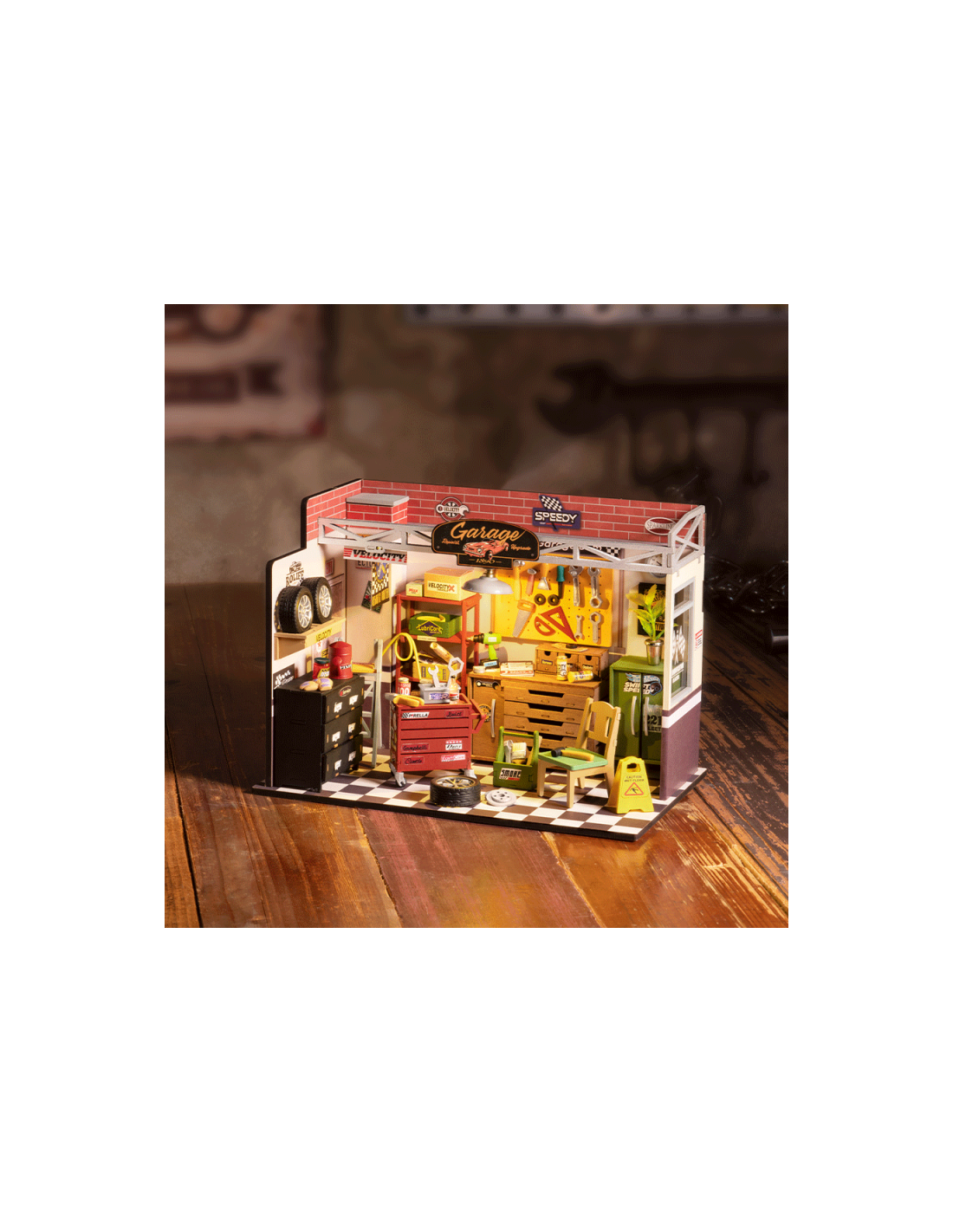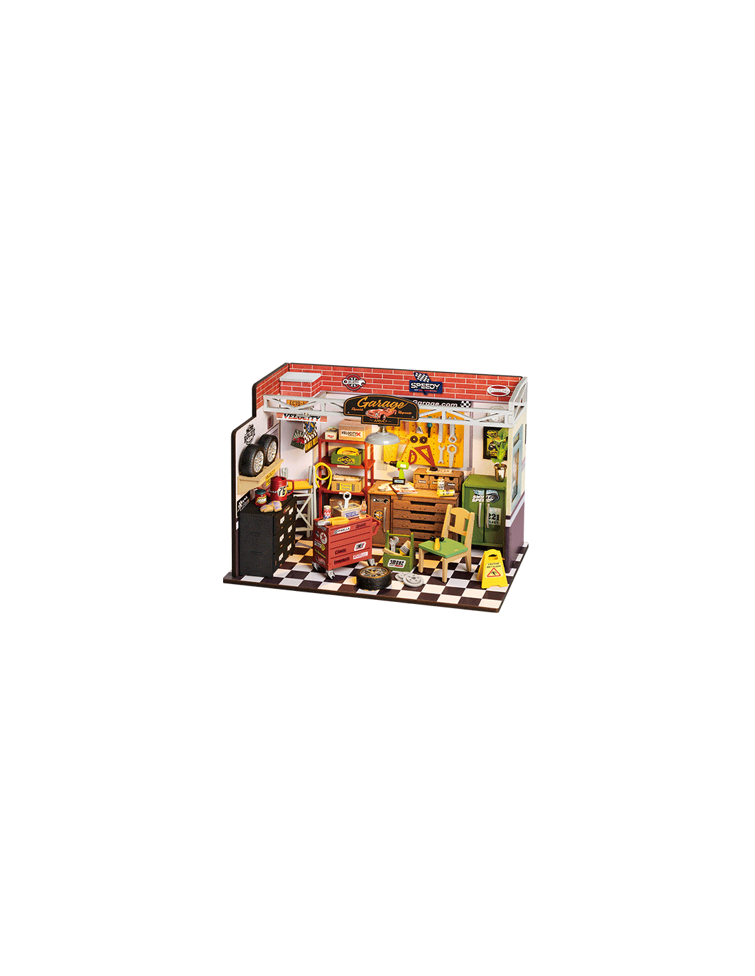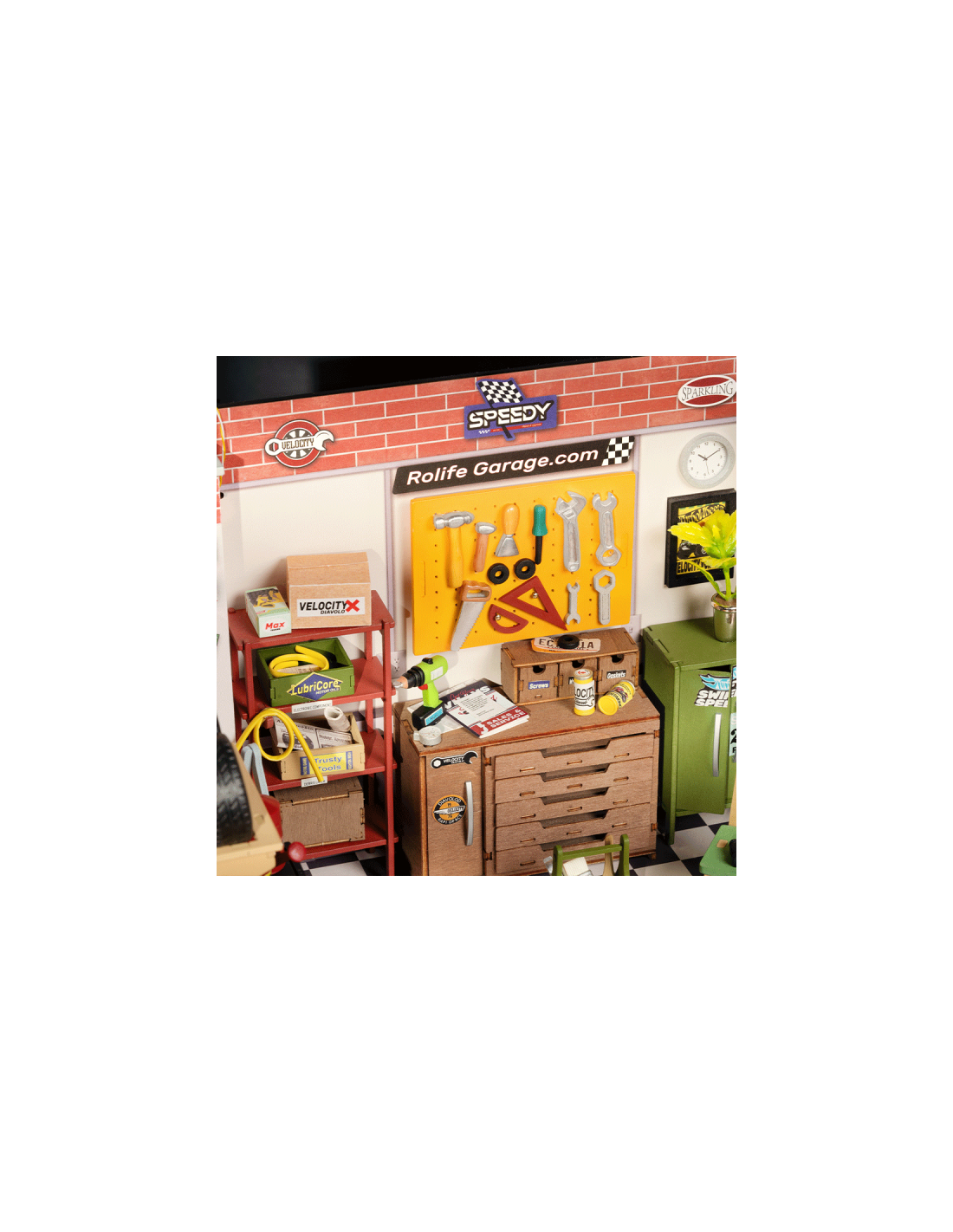 Rolife te trae lo que todos desean para su hogar: el taller de garaje perfecto. Construida con una precisión asombrosa, esta maravilla en miniatura captura tu pasión por el bricolaje con estantes, cajones, armarios, cajas, ruedas, mangueras, herramientas, guantes y accesorios elaborados con precisión. Hemos perfeccionado detalles como el letrero plegable de piso mojado, el tablero de clavijas, la caja de herramientas, la regadera, los adhesivos, la maceta, los ladrillos, el clásico suelo de tablero de ajedrez y mucho más. La habitación está bien iluminada por una lámpara LED de techo. Cada espacio está optimizado, como es habitual en un garaje doméstico ideal. Los colores y las texturas representan un espacio alegre y productivo donde las ideas fantásticas se hacen realidad.