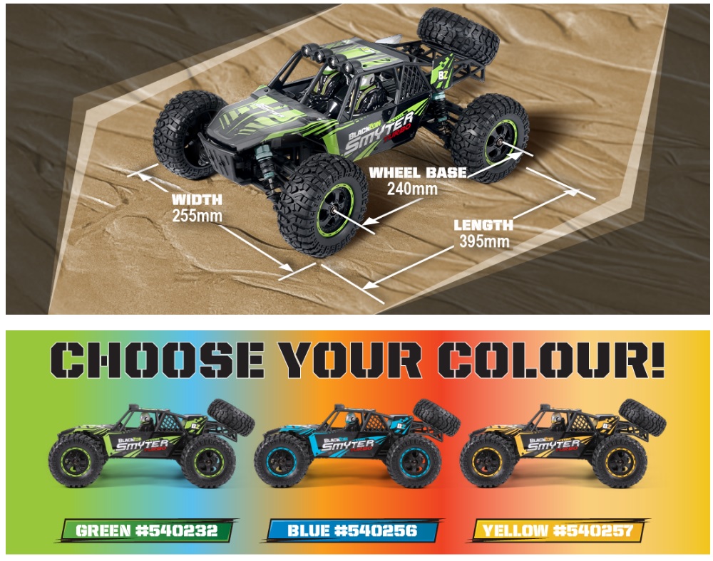 Uno de los kits más populares de BlackZon consigue aún MÁS velocidad con su motorización Brushless. El Smyter de BlackZon es perfecto para iniciarse en el RC saltando, haciendo acrobacias, o simplemente corriendo a gran velocidad.