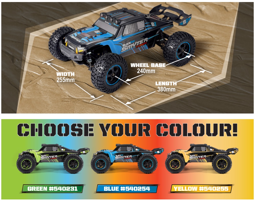 Uno de los kits más populares de BlackZon consigue aún MÁS velocidad con su motorización Brushless. El Smyter de BlackZon es perfecto para iniciarse en el RC saltando, haciendo acrobacias, o simplemente corriendo a gran velocidad.
